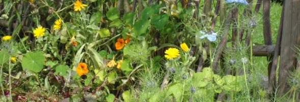 Umrahmt von einem geflochtenen Weidenzaun gedeihen Kräuter, Gemüse, Blumen und vieles mehr!